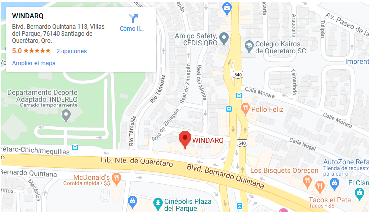 Mapa de localización del show room y oficinas de WINDARQ México en Querétaro, desde donde se atiende el Guananjuato, Celaya y el Bajío.